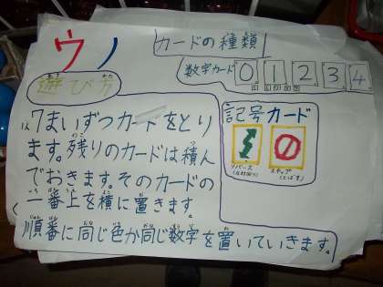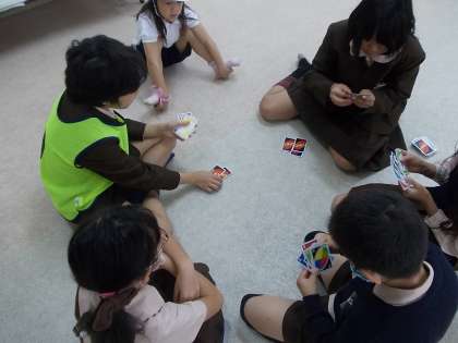「ウノ」です。ルールを知らない低学年は、高学年とペアで遊んでいました。