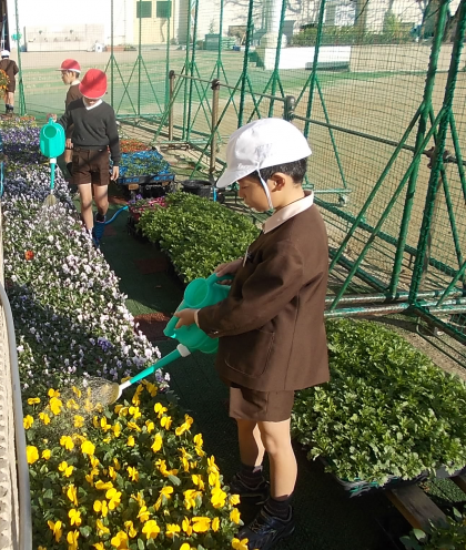 花いっぱいプロジェクトで育てている「パンジー」「ビオラ」の水やりを毎日しています。大きくなりました。今日(2日)5時間目に出荷式を予定しています。