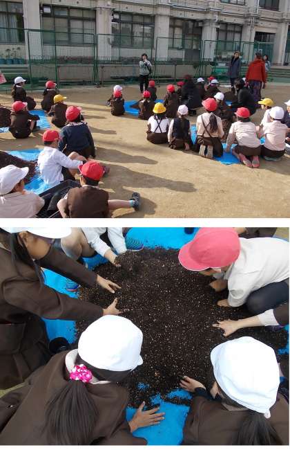 まず、土に肥料を入れ、混ぜます。「素手が気持ちいい!」と言っている子や、「気持ち悪い!ミミズがおるかも?」と言っている子、などいろいろです。