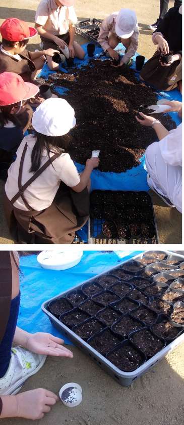 次にナノハナの種まきをしました。保護者の皆様にもお手伝いいただきました。