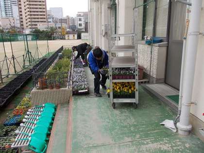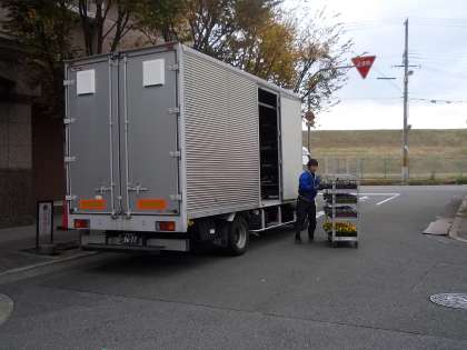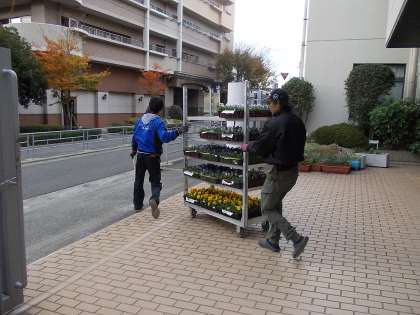 2日に出荷式を終えたパンジービオラですが、3トントラックに乗せられて、40株×12ケース=480株が、今日、大阪ステーションシティへ出荷されました。