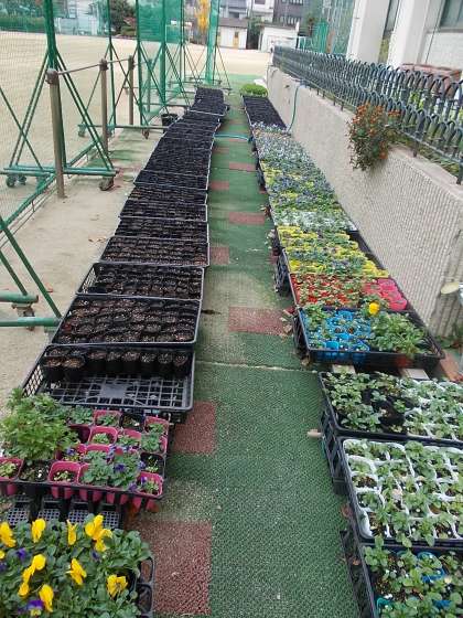 右側が地域、見守り隊のみなさんにお配りする予定のパンジー、ビオラ、ノースポールです。左側は先日種まきをしたナノハナです。
