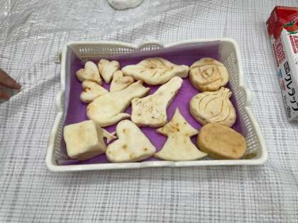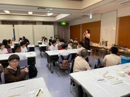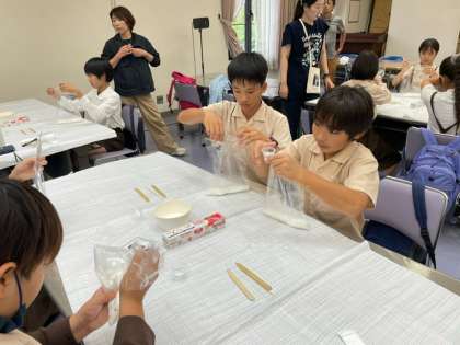パルシェ香の館で、石けん作り体験をしています。パーム油を主原料としてハーブ油で香づけ、キンセンカの効能を合わせた天然石けんです。