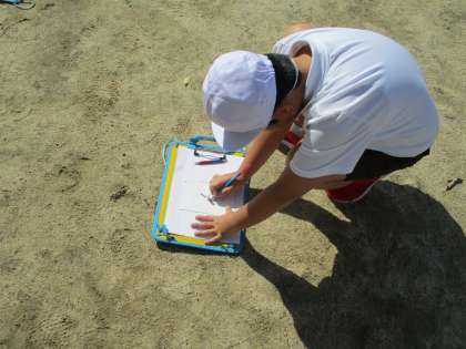 かげと太陽の学習で時間の経過によって太陽とかげがどのように変わっていくのかを観察しました。紙にストローを立ててストローのかげを、午前、正午、午後と3回記録しました。しゃ光板で太陽の位置を確認し、太陽の反対側にかげができることがわかりました。