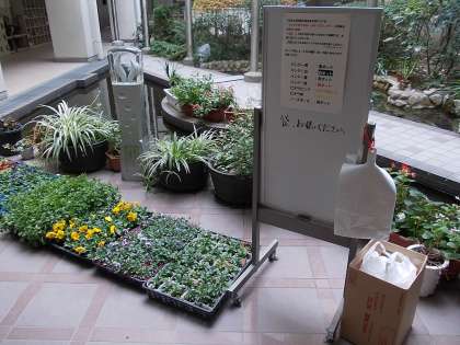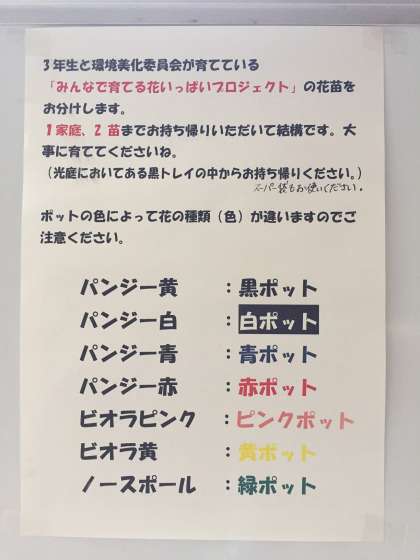 3年生と環境美化委員会で育てている「パンジー」「ビオラ」「ノースポール」とお分けします。