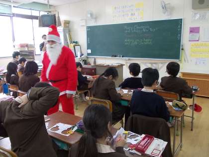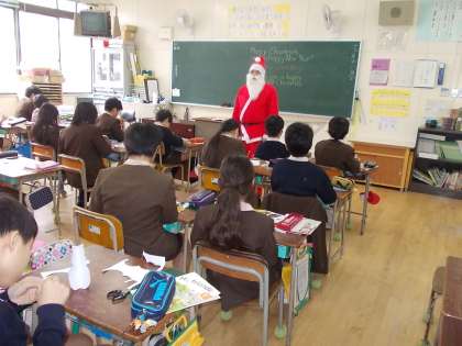 毎年恒例(?)のサンタク「ローズ」が現れました。56年生の外国語の時間です。