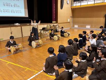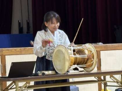クイズ形式で食べ物や行事について知り、韓国の楽器を演奏したり、歌や手遊びをしたりすることができました。