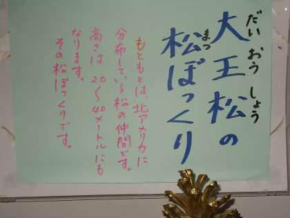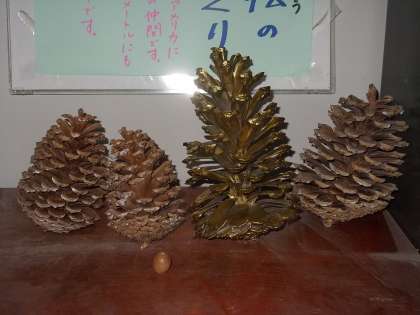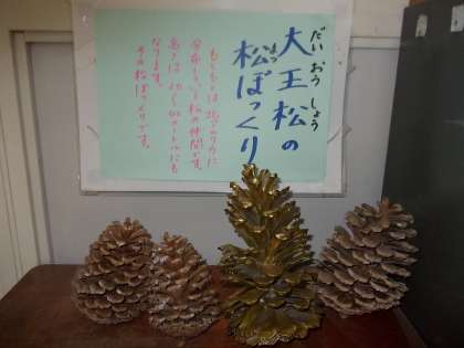 保護者の方から、「子どもたちに見せてあげてください。」と、大きな松ぼっくりをいただきました。ダイオウマツあるいはダイオウショウという北アメリカ原産の松の松ぼっくりです。さすがアメリカ、松ぼっくりもでかいですね。