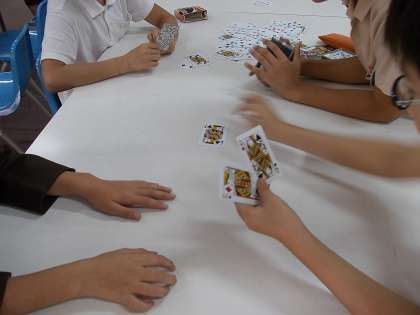 トランプ、ウノ、けん玉、、ビー玉、おはじき、ジェンガ、オセロなどなど、室内(図書室)で遊ぶことのできる遊びをしています。