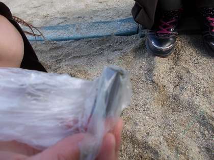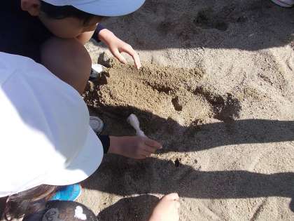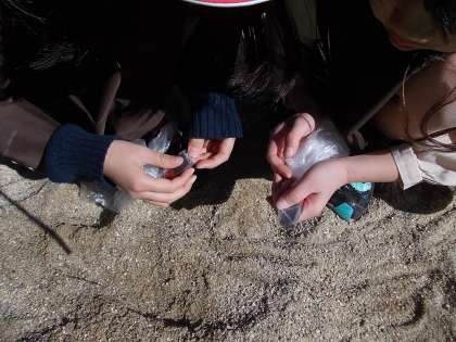 じしゃくの力を使って、校庭の砂場でさ鉄さがしをしました。