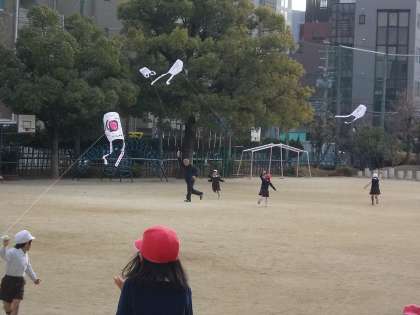 今日はたこあげをしました。子どもたちは、たこが高くあがるように、一生懸命走っていました。