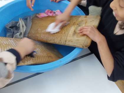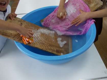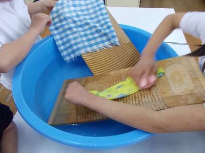 今日は3年2組が洗たく板を使って洗たくをしました。