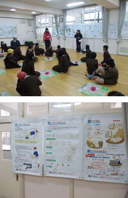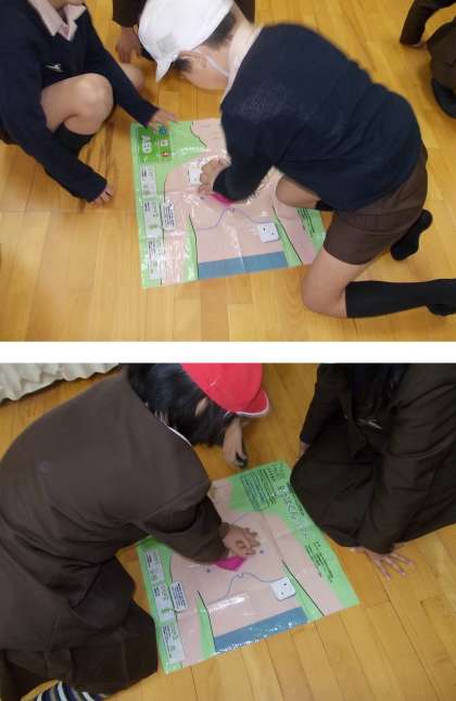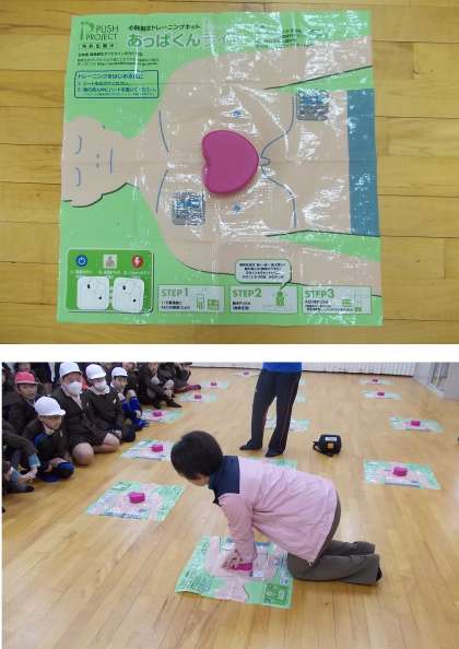 AEDのパットをはる疑似体験をしてから、心臓マッサージをしました。1分間に100回以上の速さで押しこみます。腕を伸ばして、全体重を乗っけて押すのが難しそうな子もたくさんいました。うまく押せると、「キュッキュ」という音がなります。