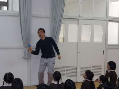 多目的室に、日本けん玉協会北摂支部から、けん玉名人「ミスター イトッチ」が現れました。(子どもたちは「伊藤先生だ!」と言っていましたが、違います、ミスターイトッチです。)