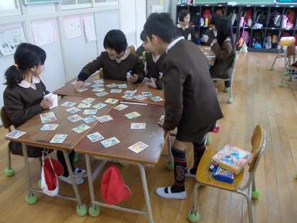 その後、1組は教室でかるたを、2組は多目的室でけん玉とこまをして遊びました。