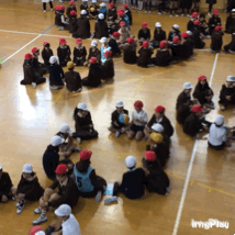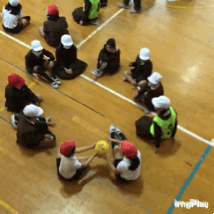 集会委員が「ゴロゴロ・・・」といっている間、となりの人にボールを渡していきます。「ピカピカ・・・」と言ったら、ボールを逆の方向へ渡します。