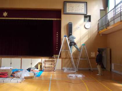 講堂の放送設備が新しくなりました。スピーカーも新しくなりました。大阪市内の小中学校、順番に入れ替えています。本校は昭和62年に今の場所に校舎が移転されたときにできた講堂放送設備のままでした。30年ぶりのリニューアルです。