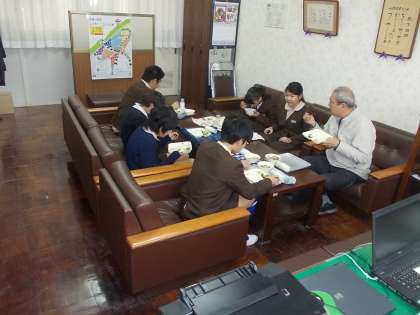 6年生が4〜6人ずつ、校長室で校長先生と給食を食べます。