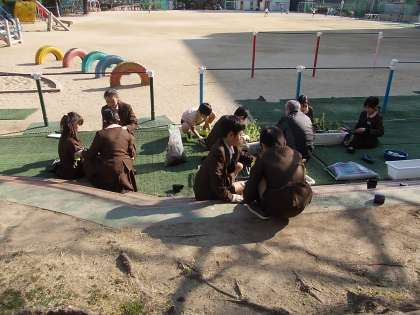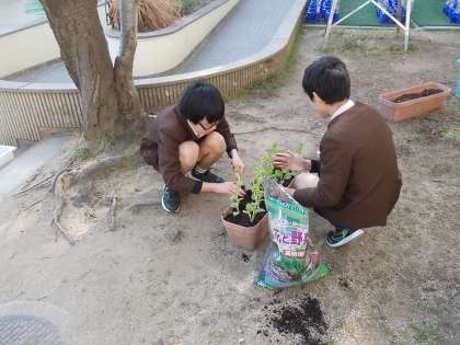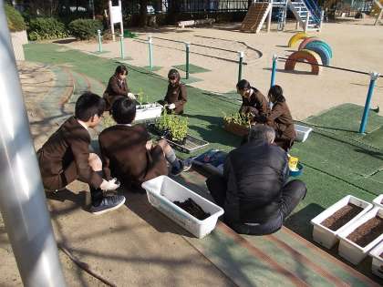 今日は環境美化委員の児童が、ナノハナを1つのプランターに9株移植しました。