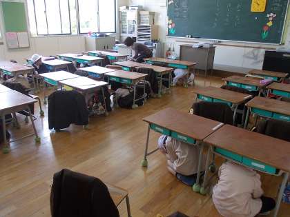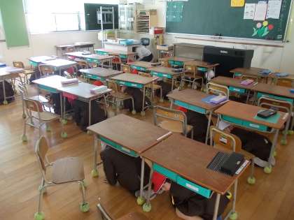 地震が発生したら机の下にもぐります。特に頭を守ります。