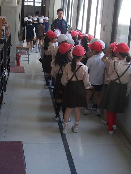 ゆれがおさまったら、運動場に避難するために、先生の指示で廊下に並びます。