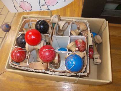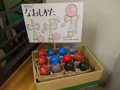 バナナホールにけん玉コーナーがあります。雨の日はもちろんのこと、晴れの日にもけん玉遊びをしにきています。
