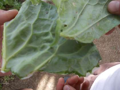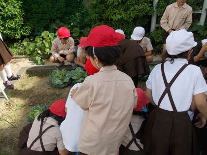 2年生の時に植えた学習園のキャベツから、アオムシを探しています。