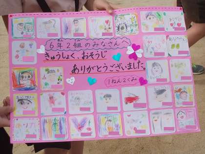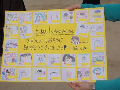 入学してから、給食当番の準備や、掃除を手伝ってくれた6年生に、1年生から「ありがとうメッセージ」が渡されました。