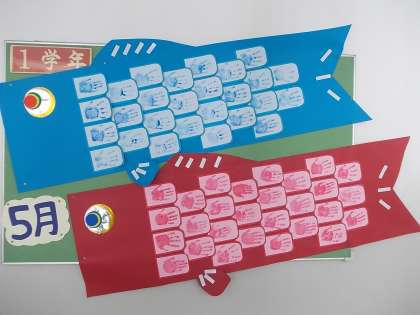 1年生の教室の廊下に、こいのぼりが泳いでいます。