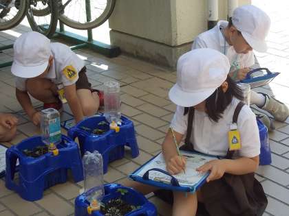 5月11日にたねをまいたあさがおの芽が出始めました。さっそく「ふたば」の観察です。