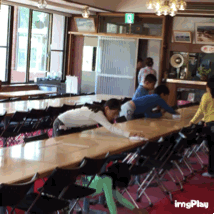 食器を配膳口に片付けたり、テーブルを拭いたりするのは食事係の仕事です。カーペットの上に落ちているご飯粒も落ちていないか確かめます。