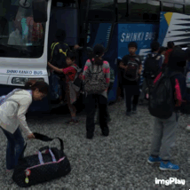 バスに荷物を積みこみます。
