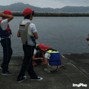 浮きと重りを竿にくっつけています。こちらはまだ何とか雨はもっています。