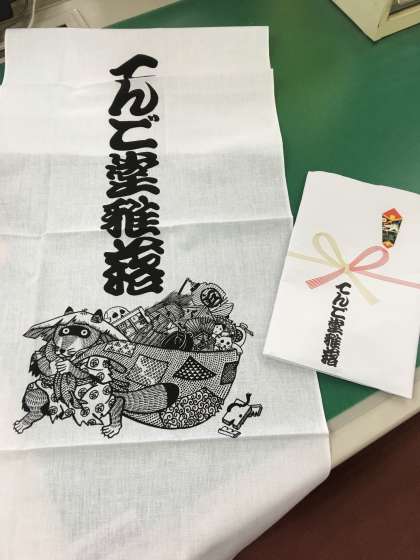 おみやげとして、雅落さんから手ぬぐいをいただきました。尼子騒兵衛さんがデザインしたものらしいです。洒落てますね〜