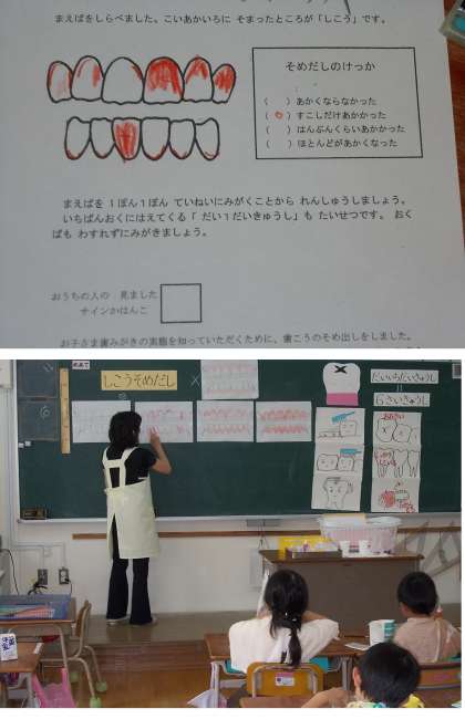つぎに、ていねいにみがけているか、「歯こうそめだし」で確かめました。赤く残る部分は歯こうが残っているところです。自分で鏡を見ながら、赤えんぴつで記録しました。ほとんど残らなかった子も、赤いところがたくさん残ってしまった子もいました。