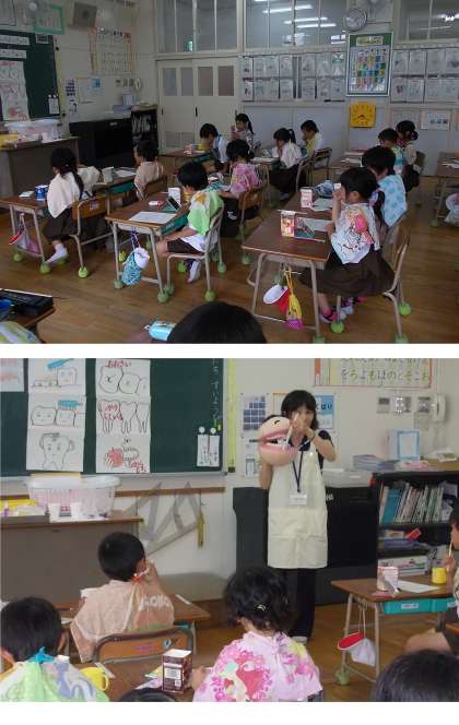 最後に「歯みがきぼうや」といっしょに歯みがきの練習。くちゅくちゅみがき→細かくやさしく歯ブラシを動かす磨き方を教えていただきました。