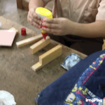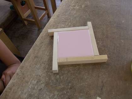 技術の様子です。なべしきを造りました。ボンド、くぎ、やすりを使って、45分内で完成させないといけないのですが、みんな時間が足りませんでした。