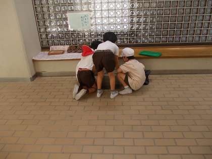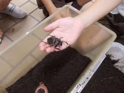 5月のドッジボール大会のときに4年生の保護者からいただいたかぶとむしの幼虫の1匹が成虫になりました。1年生の児童が、