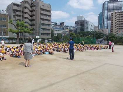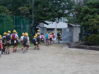 その後、運動場に集合して集団下校をしました。今日は南門から下校しました。
