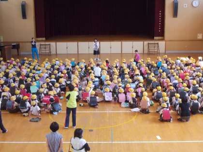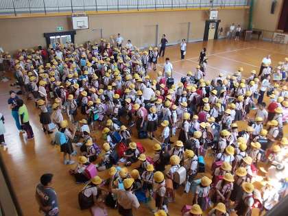 始めは講堂に学年ごとに集合し、校長先生からお話があった後、登校班に並び替えて集団下校しました。