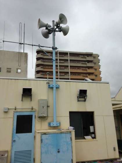 11時に大阪市の災害緊急用スピーカ—(プールの上にあります)から「大阪880万人訓練」の放送が流れました。