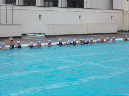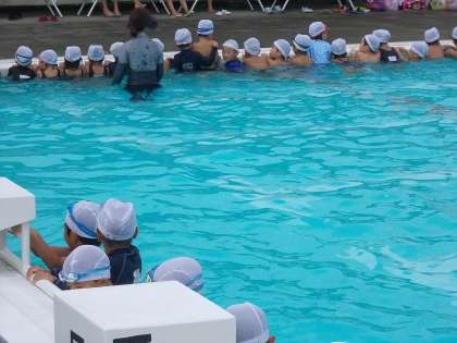 プールの中に入っているときは、まず、放送をよく聞き、落ち着いてプールサイドをつかみます。ゆれが治まったところでプールサイドにあがり、壁から離れて待ちます。