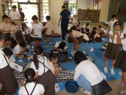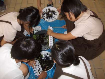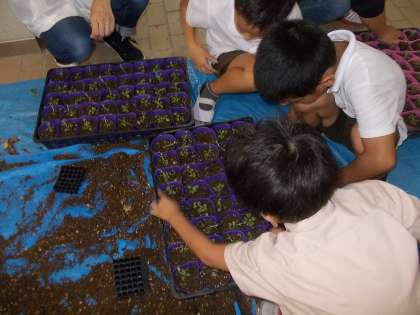 わりばしでつっついたプラグ苗を、やさしく土ごとつかみ、指先で穴をあけたビニルポットに植え替えました。