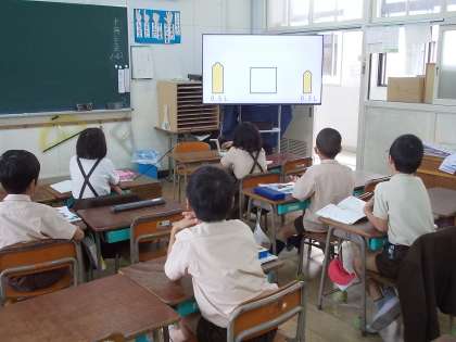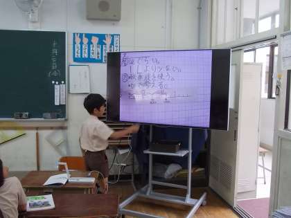 ICT機器を活用しています。大型モニター、書画カメラを使って、児童が発表しています。