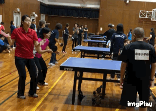 福井教諭の華麗なるサーブ。中津チームの勝利に貢献していました。チームの皆さんは、とても落ち着いて試合に臨んでおられますので、好成績が期待されます。