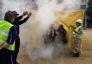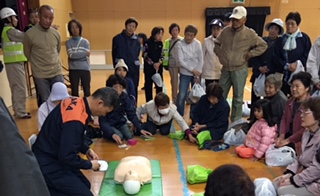 学校に着いた後は、地域の皆さんは水消火器訓練、煙中体験、AED訓練、応急処置訓練などをされました。