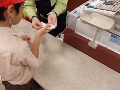 野菜が高くなっている中、ライフさんからお金をいただいてクイズにあった野菜を買っています。