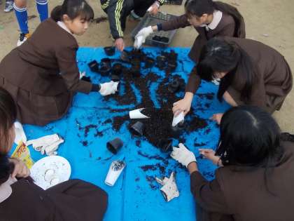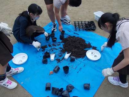 環境美化委員会で、ナノハナの種まき(221ポット)をしました。