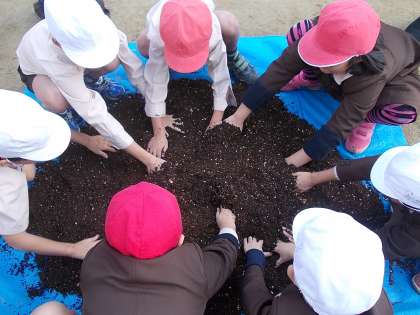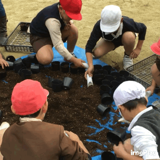まず、土と肥料をまぜ、黒トレイに5個×8列=40個のポットをつくります。