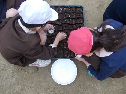 次に、種を3粒程度まき、2mmの土をかぶせます。ちっちゃい手で一生懸命頑張る姿がかわいいです。